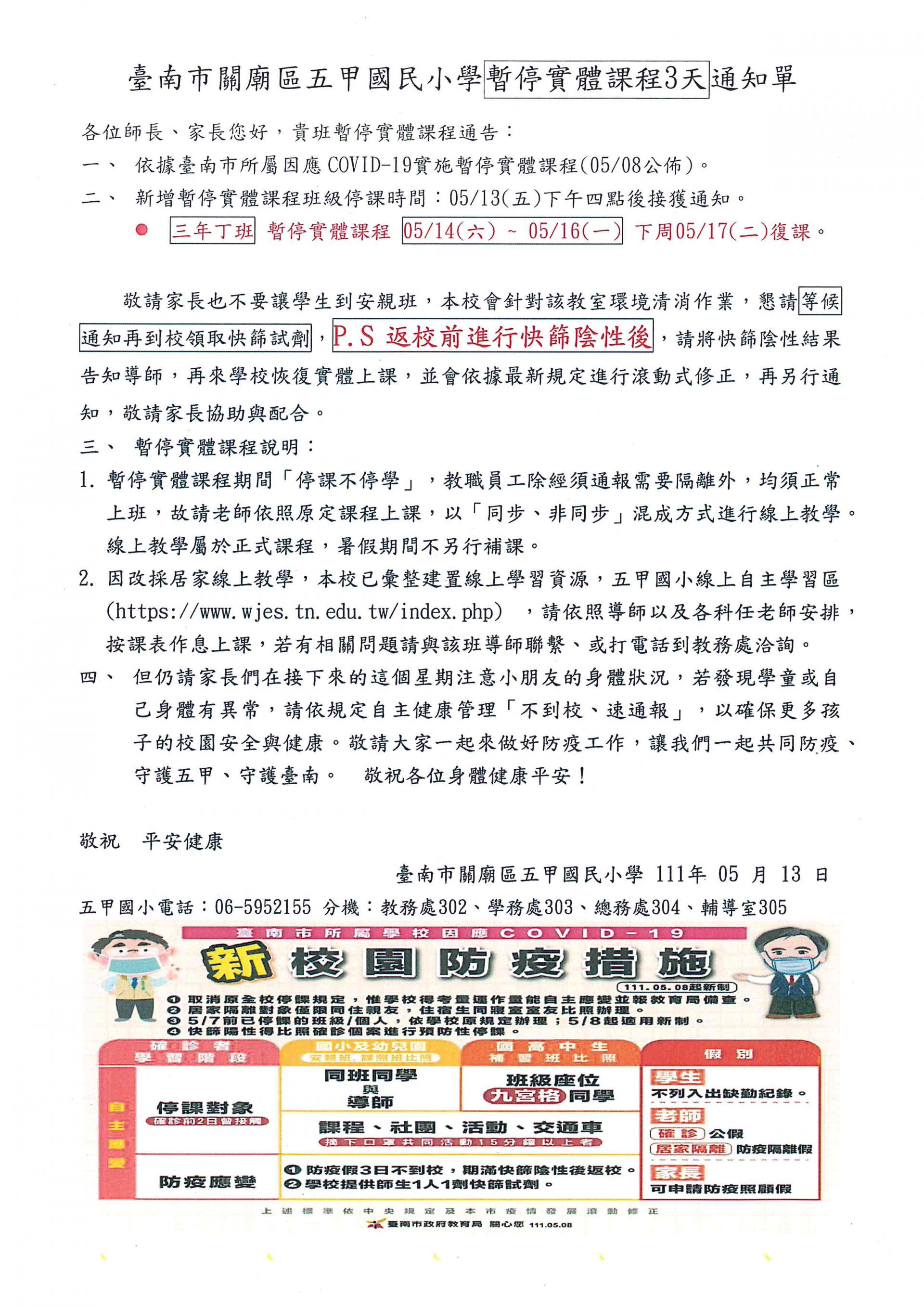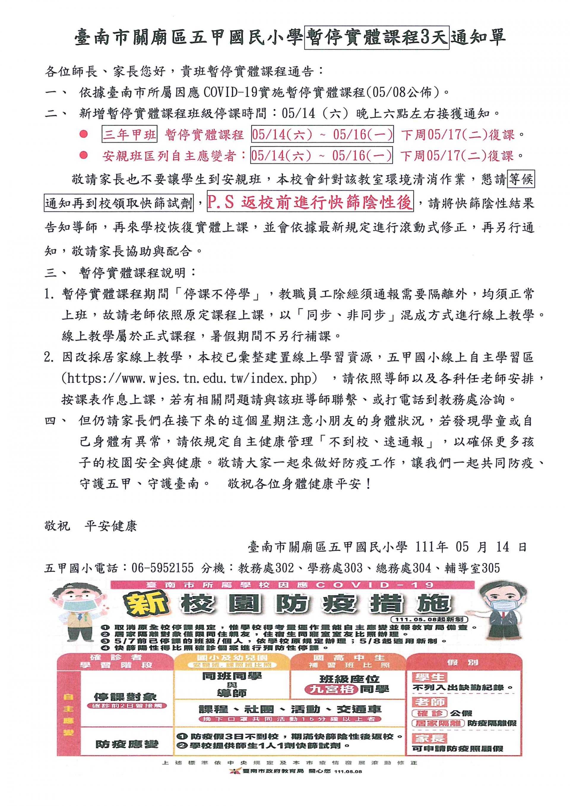 3 、 05 月 16 日(一)快篩陰性可於 05 月 17 日(二)返校。