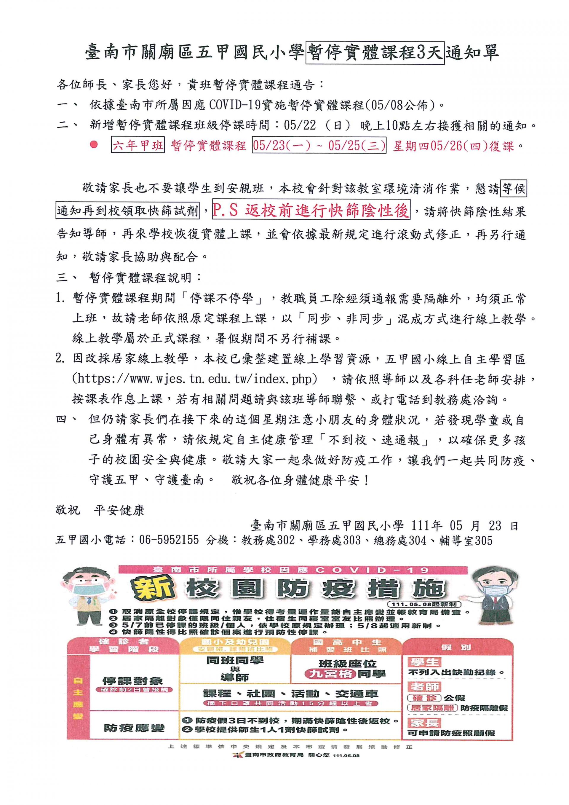 2 、暫停實體授課:自 05 月 23 (一) 到 05 月 25 日(三),