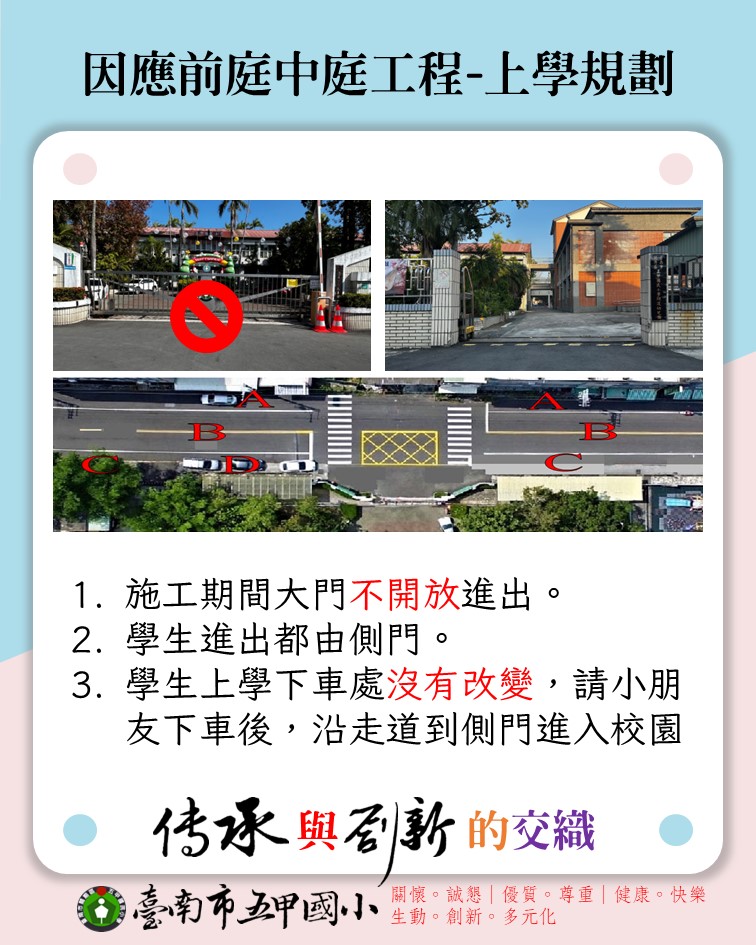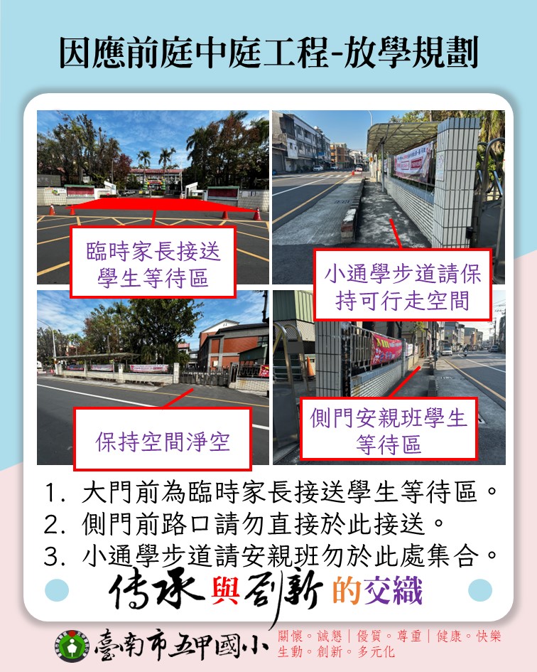 - 家長接送區無變動,只有學生進出校園動線改變,改由【側門】進出。