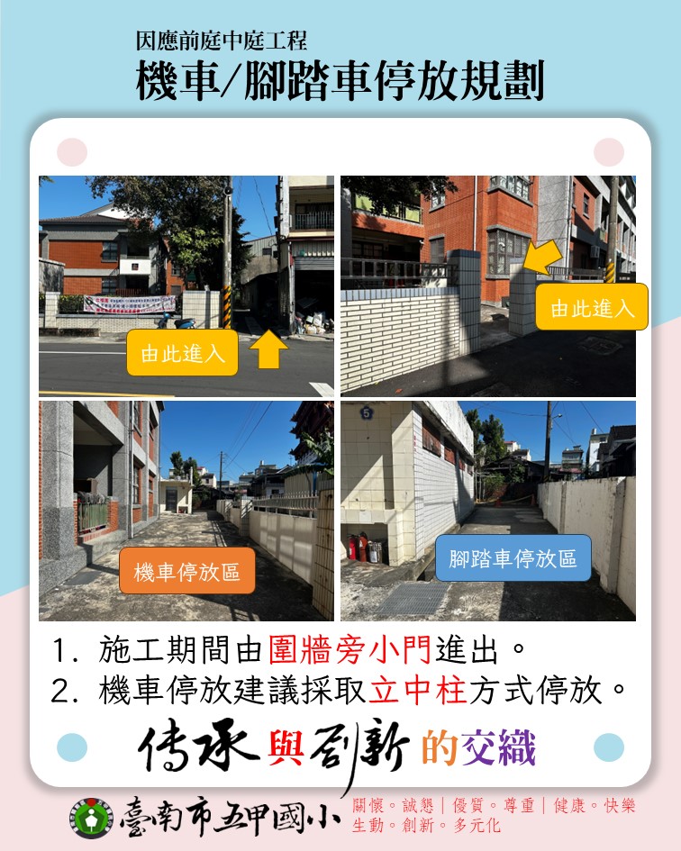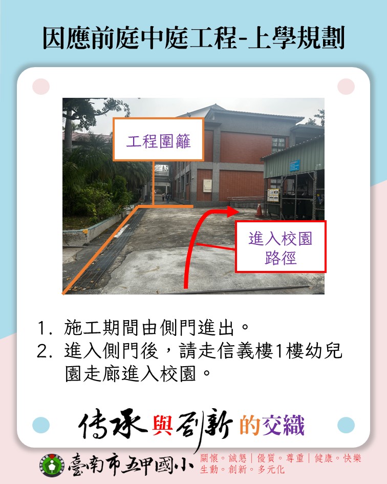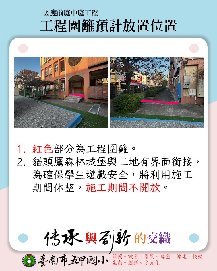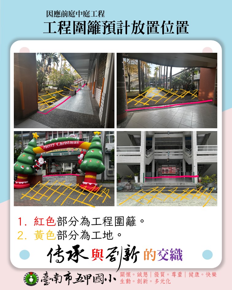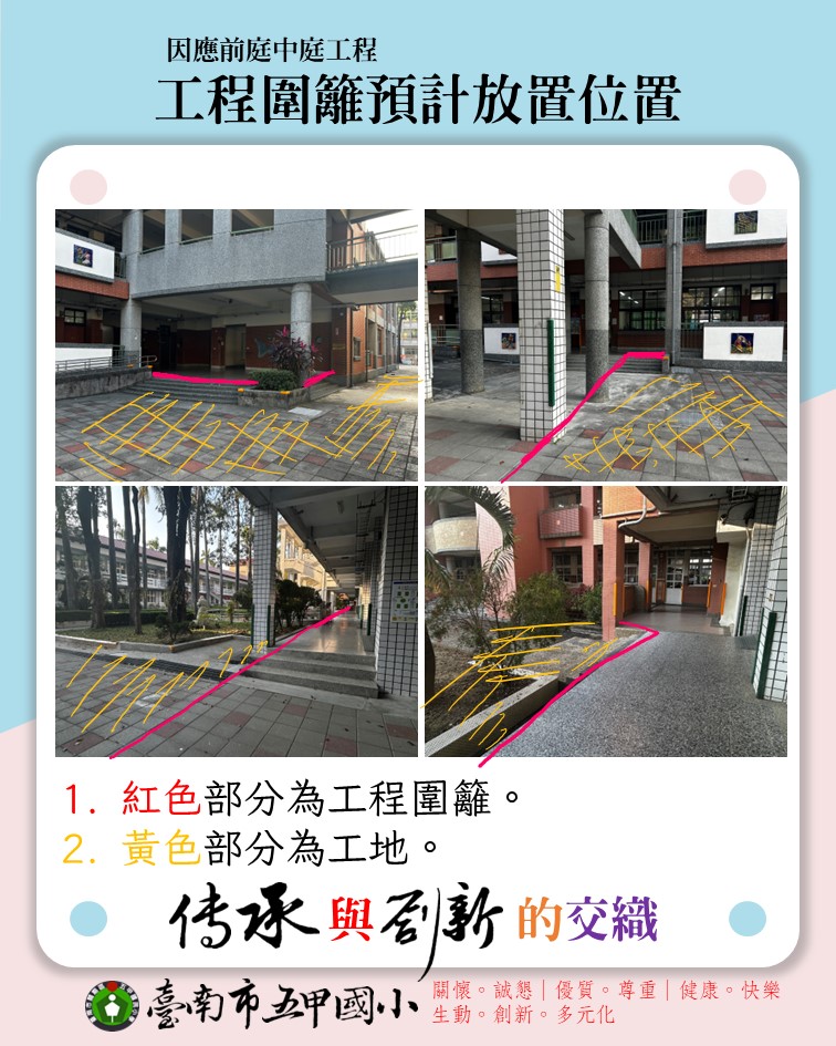 - 校園主要通道將臨時調整,請師生依指示牌或安全圍籬規範行走,避免進入施工區域。