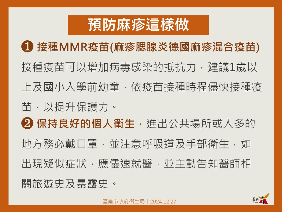 一、依衛生福利部疾病管制署本(114)1 月 7 日新聞稿指出,我國去(2024)年迄今累計 33 例麻疹病例,年齡介於 20 多歲至 50 多歲,其中 21 例為國內感染病例(含 4 起群聚),另 12 例為境外移入病例。麻疹為高傳染性疾病,可經由空氣、飛沫傳播或接觸患者鼻咽分泌物感染,出疹前後 4 天均具傳染力,若出現發燒、鼻炎、結膜炎、咳嗽、紅疹等症狀,應提高警覺儘速就醫診斷,以阻斷疫情傳播。