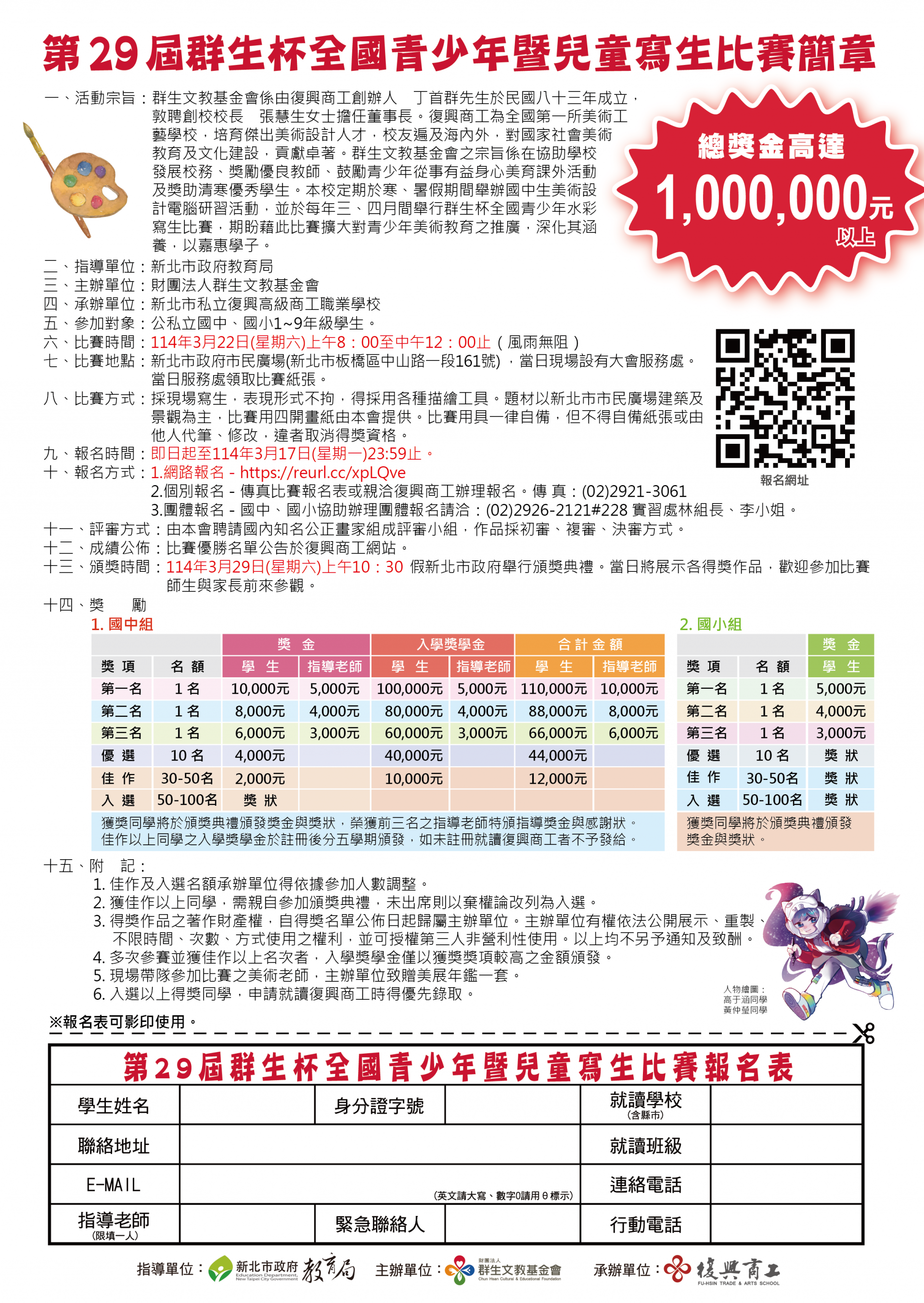 四、國中組獲獎同學得入選以上獎狀者,畢業申請本校優先錄取。五、線上報名網址: https://reurl.cc/xpLQve
