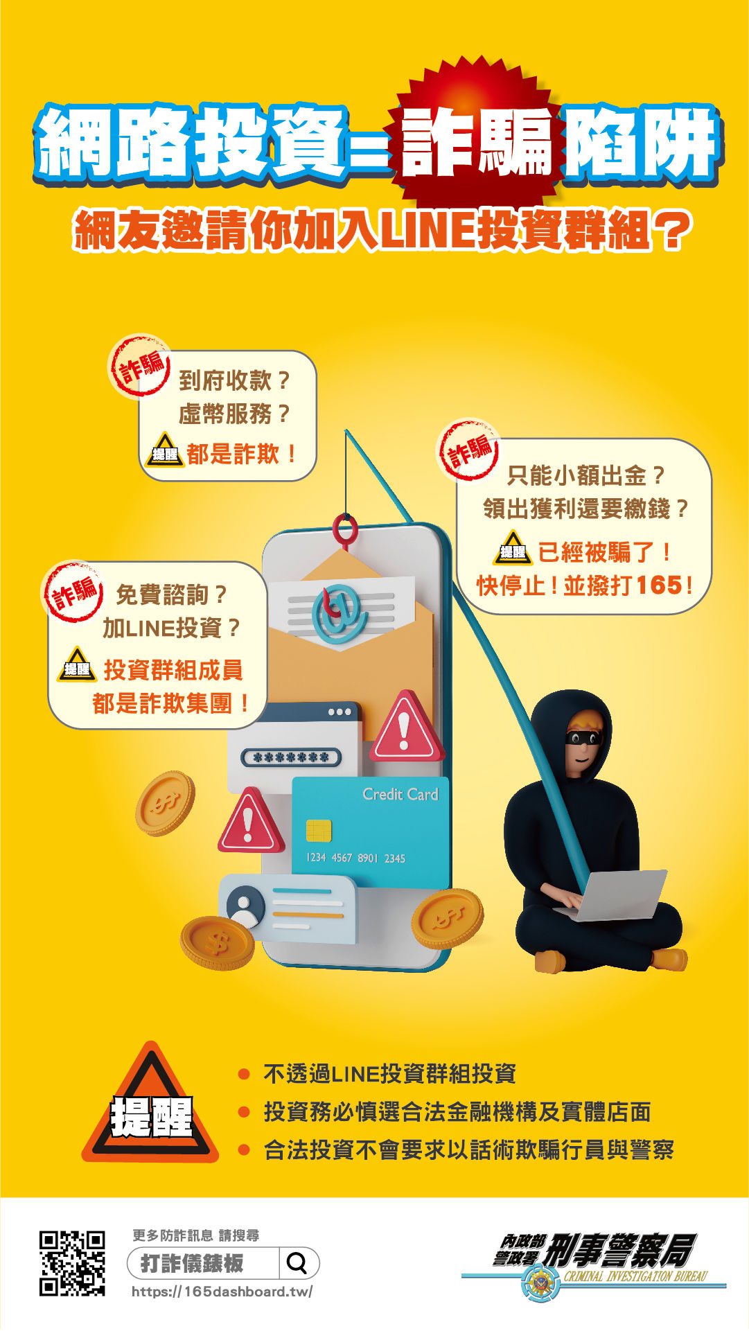 四、檢附本案宣導海報(附件1)及有關假冒公務機關與假檢警詐騙(附件2)、網路投資詐騙(附件3)之宣導海報,請適時宣導以提升師生識詐反詐意識。