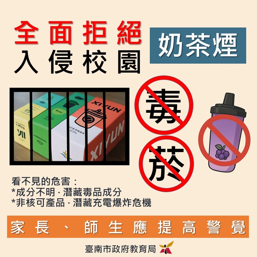 近來新型電子煙—「奶茶煙」(俗稱奶茶杯)外型吸睛,成分不明,疑為新興毒品包裝,請各校提高警覺;另前亦有不肖業者在電子煙油添加俗稱「喪屍煙彈/油」的「依托米酯(行政院已於 113 年 11 月 27 日公告列為二級毒品管制)」之報導,均請於菸害防制宣導時併入反毒議題加強宣導。