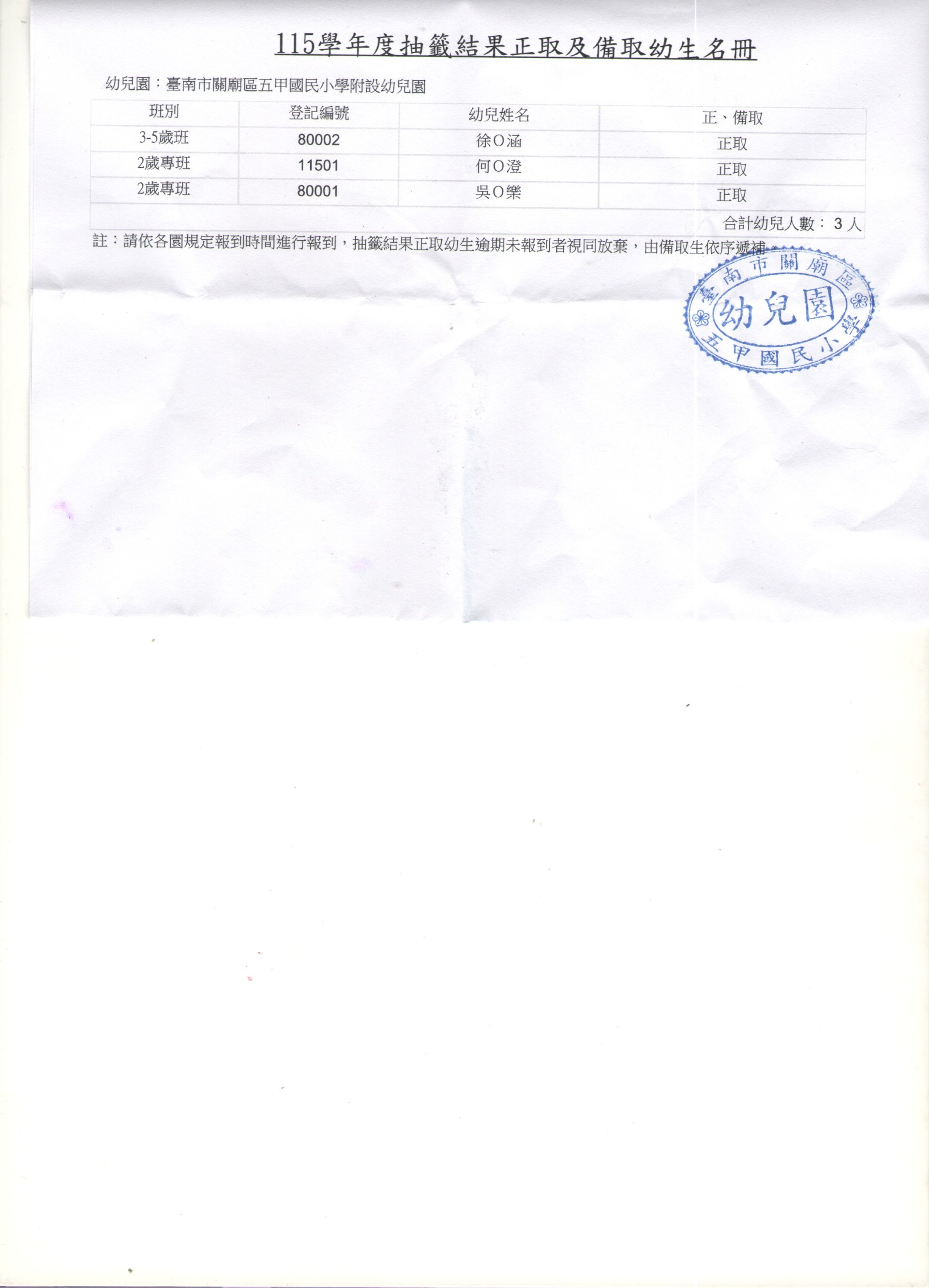 115 學年度幼兒園新生錄取名單如附件,及網路報到 QR code 請家長自行在網路上按線上報到,若有操作上的問題請電洽幼兒園 5952155*201