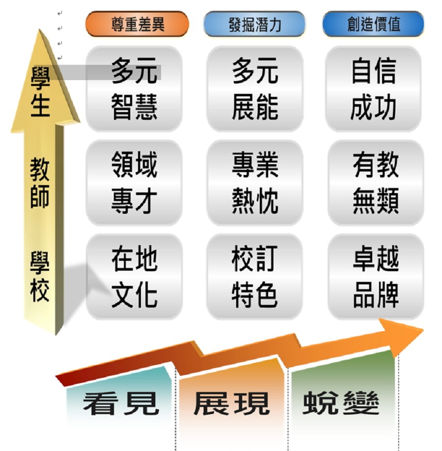 協助教師提升專業知能;提供學生多元化學習活動,幫助學生均能獲得成功的經驗,肯定每一位學生都有能力可以學習;以有教無類及因材施教達成適性發展,帶好每一位學生。
