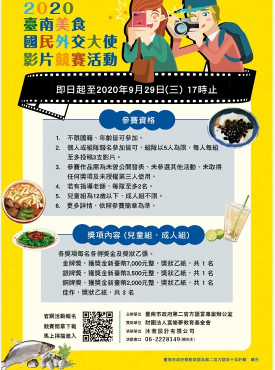 五、「2020 臺南美食國民外交大使影片競賽活動」提供參與者及優勝者獎金等獎項,希冀藉由英語影片競賽方式提升學生英文口說能力,活動宣傳網頁:https://reurl.cc/xZ8xWE
