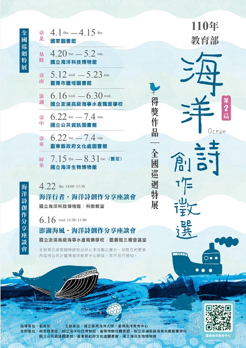 三、為提升群眾對臺灣各地海洋文化特色之了解,並使更多師生及民眾欣賞優良海洋文化創作詩作,將以分組分區形式至全國各地進行教育推廣,使有志於以文學藝術形式之多元管道推動海洋教育者與純粹享受閱讀樂趣受眾者皆有所收穫,落實提升全民海洋素養政策,以逐漸達成海洋生活化之理想。本次除全國巡迴特展,將辦理 2 場「海洋詩創作分享座談會」,邀請得獎師生進行詩作賞析,並分享如何透過教學實踐歷程帶領並指導學生進行創作,有關全國巡迴特展及座談會場次資訊,可參考活動頁面: https://tmec.ntou.edu.tw/p/404-1016-56977.php?Lang=zh-tw 。