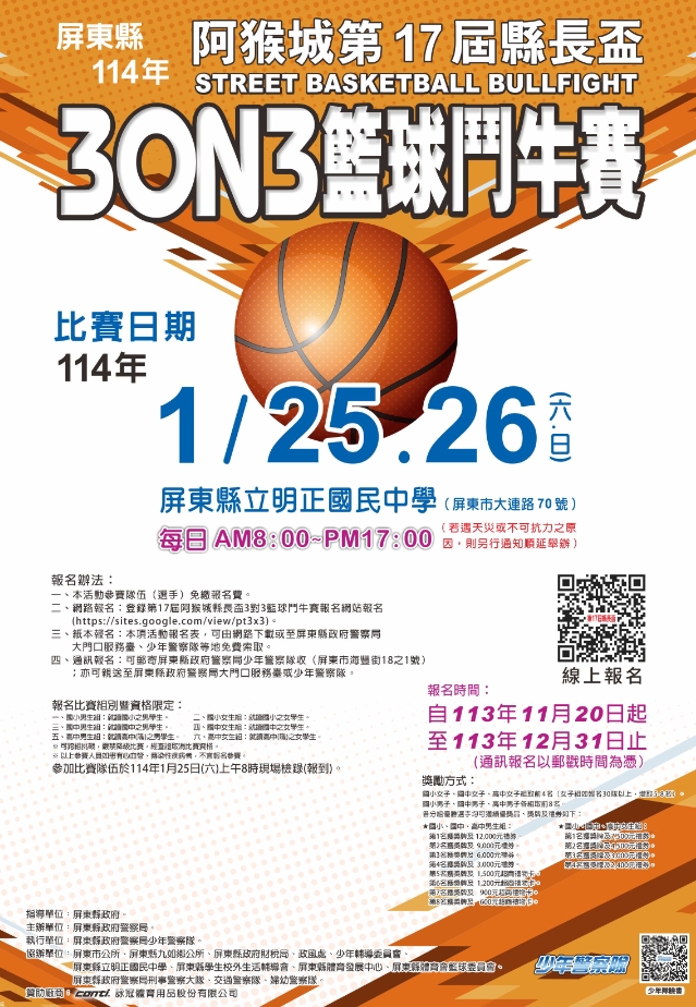 2、網路報名:登錄屏東 3X3 籃球鬥牛賽報名網( https://sites.google.com/view/pt3x3 )報名。