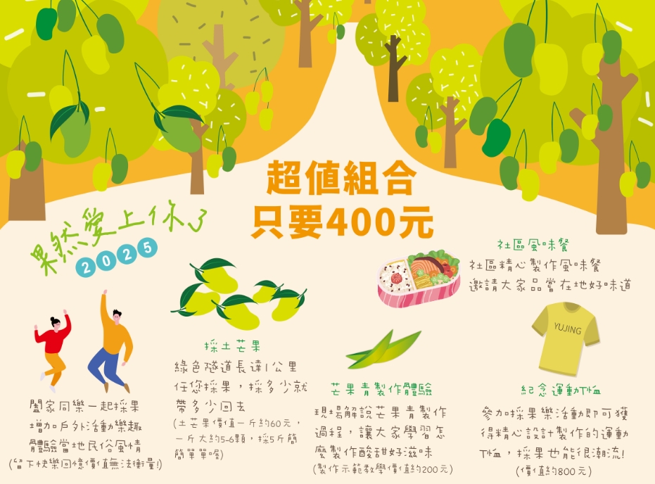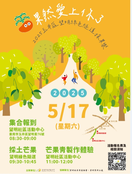 一、每年四到五月土芒果成熟時,漫步臺南市玉井區望明里綠色隧道,可以見到顆顆飽滿的青色土芒果,居民大多用來製作芒果青,酸酸甜甜的味道被比喻為戀愛的感覺。本所擬開放望明里綠色隧道提供遊客採土芒果,現場教學製作芒果青,一同愛上酸甜好滋味。