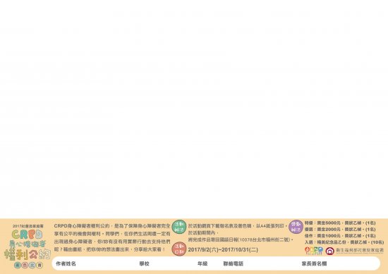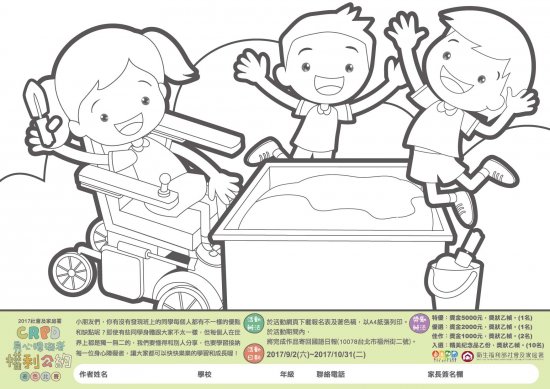 三、隨函檢送「2017 社會及家庭署 CRPD 身心障礙者權利公約著色比賽」活動辦法(附件 2 )、各年級組著色稿及繪畫稿各 1 張(附件 3 )及活動報名表(附件 4 )。
