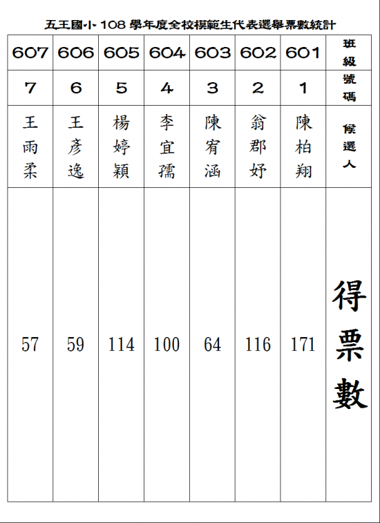 恭喜 601 陳柏翔同學、 602 翁郡妤同學以及 605 楊婷穎同學以前三高票當選本校模範兒童