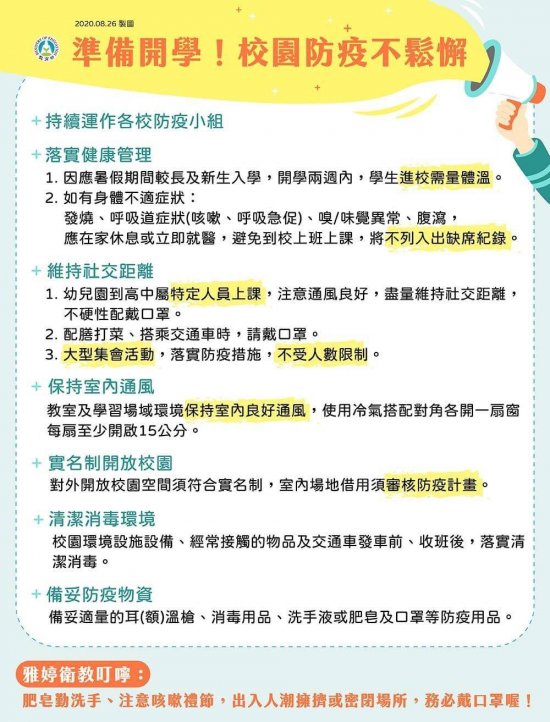 2.由於 8 月 31 日和 9 月 1 日這兩天開放新生家長入校接送孩子(請家長配戴口罩入校),且因暑假假期較長,因此開學第一、二週早上上學期間,大門和後門會進行體溫量測。後續實施,會依教育局相關規定辦理。