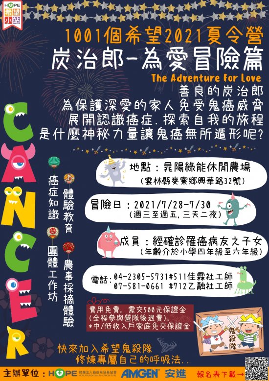 二、藉由【1001個希望夏令營】之活動(以下簡稱本活動),協助癌友家庭之兒童面對家長罹癌的自我情緒察覺,以營隊活動引導兒童對癌症有正確知識,透過團體活動及遊戲促成同儕間相互支持及理解。