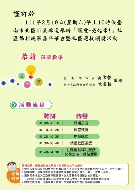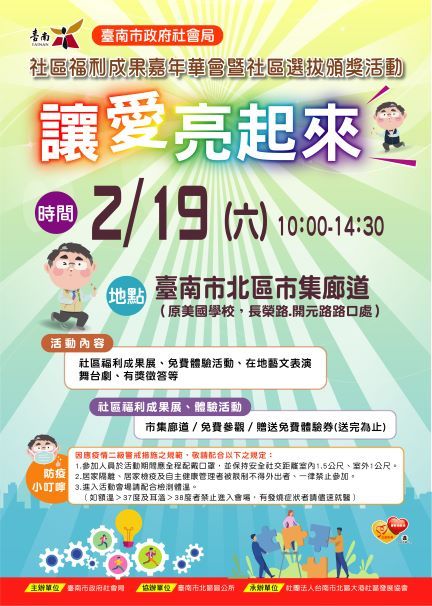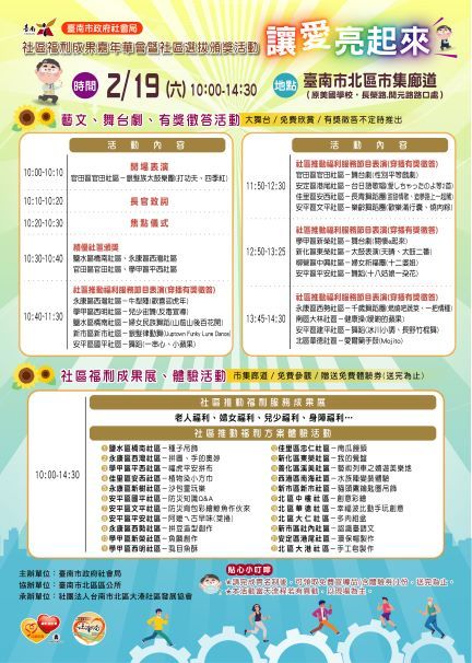 (三)活動內容:臺南市社區福利成果展、免費體驗活動、在地藝文表演舞台劇、有獎徵答等。