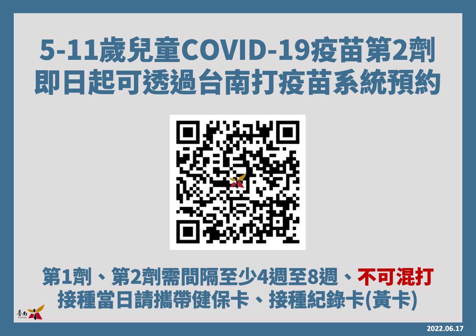二、為提升自我保護力,請貴校(園)鼓勵 5-11 歲之學生家長至「臺南打疫苗」平台預約施打(https://health-reservation.tainan.gov.tw/),接種當日請攜帶健保卡、接種紀錄卡(黃卡)至接種地點。