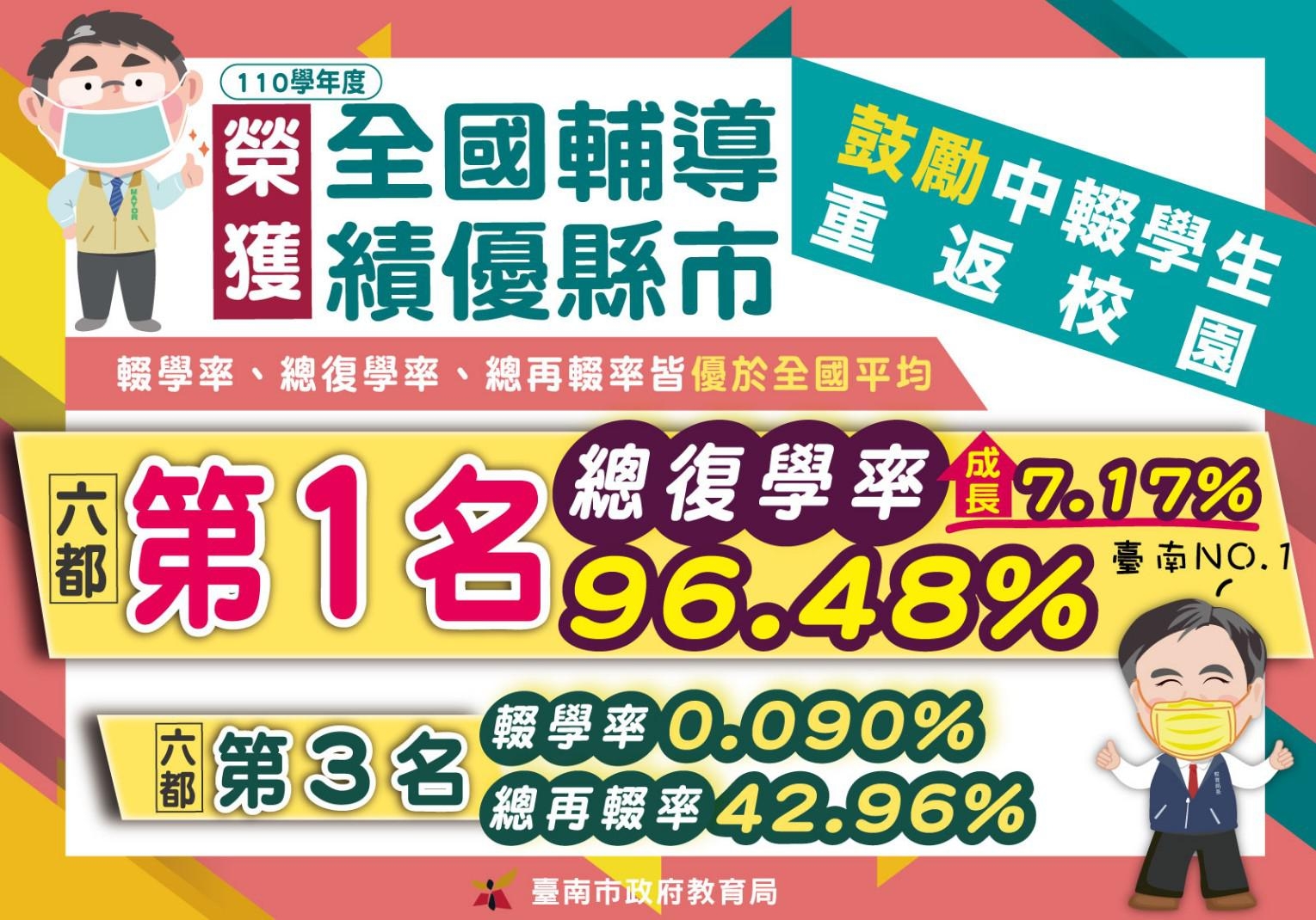 三、用心陪伴中輟生,鼓勵重返校園。教育部公布最新中輟數據統計,臺南 110 學年度復學率成長 7.17%,輔導成效六都第一!