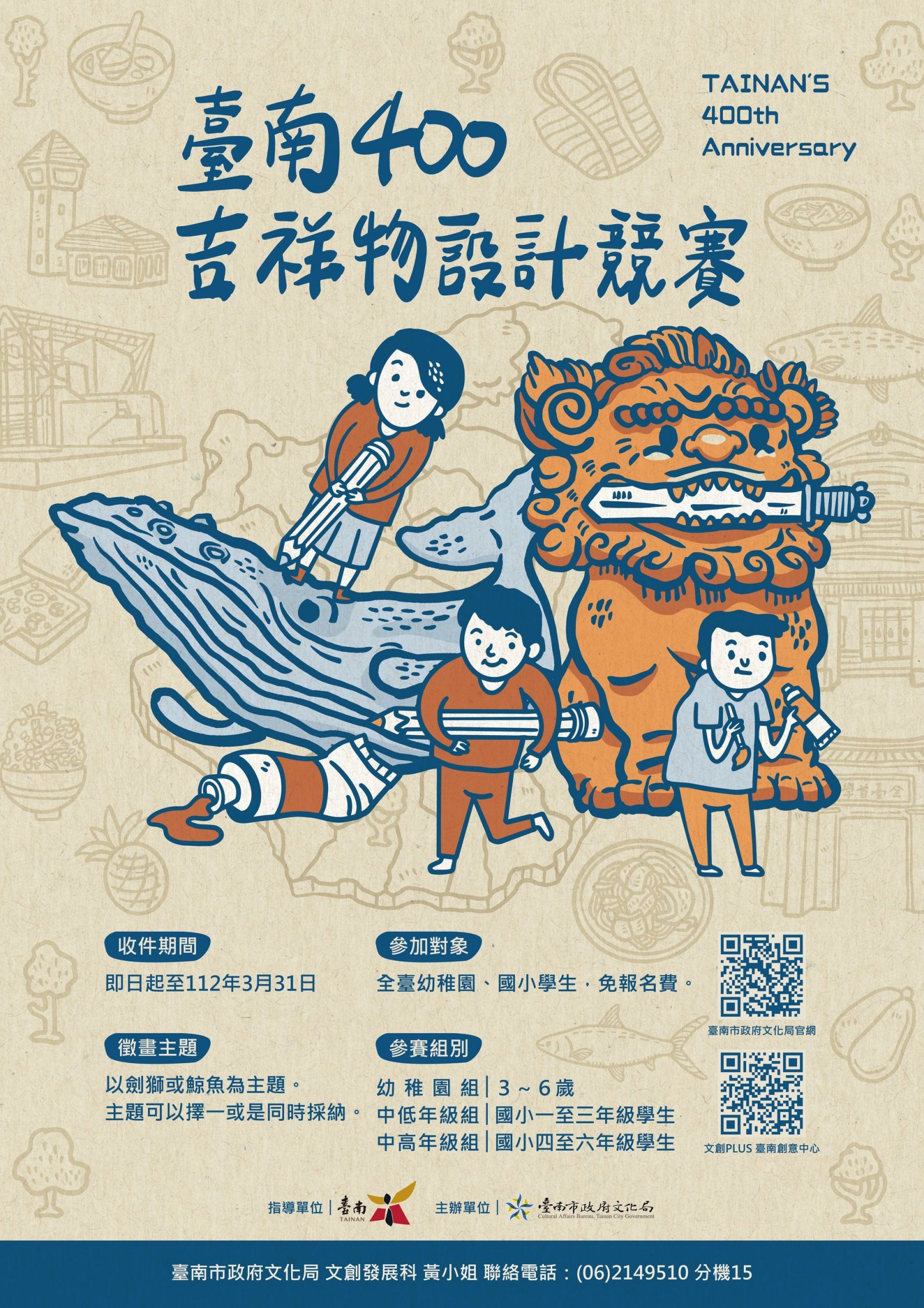二、為擴大各界響應加入活動行列,特規劃「臺南 400 吉祥物設計競賽」,邀請全臺幼稚園、國小生參加,吉祥物主題以安平特色文化「劍獅」以及早期海神信仰「鯨魚」為主題,邀請小朋友創意發想,繪製專屬「臺南 400」吉祥物。