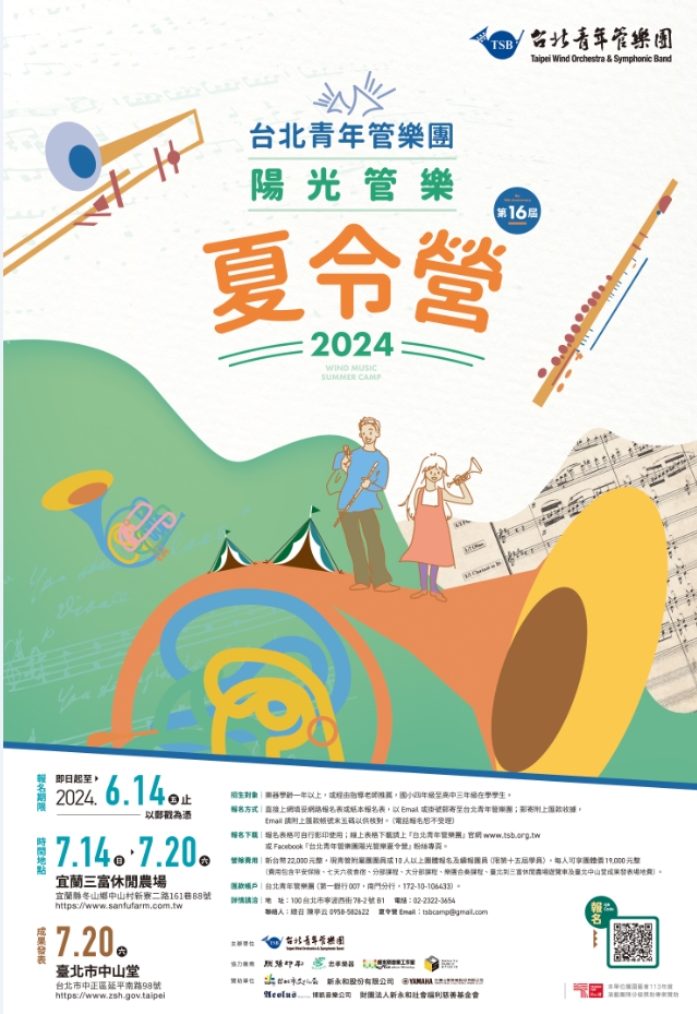 一、台北青管暑假最受歡迎的陽光管樂夏令營,聘請專業師資,規劃豐富充實課程,並規劃於 113 年 7 月 20 日(六)下午 2 點 30 分假臺北市中山堂中正廳舉辦成果發表會,歡迎喜愛管樂演奏學生踴躍報名參加。