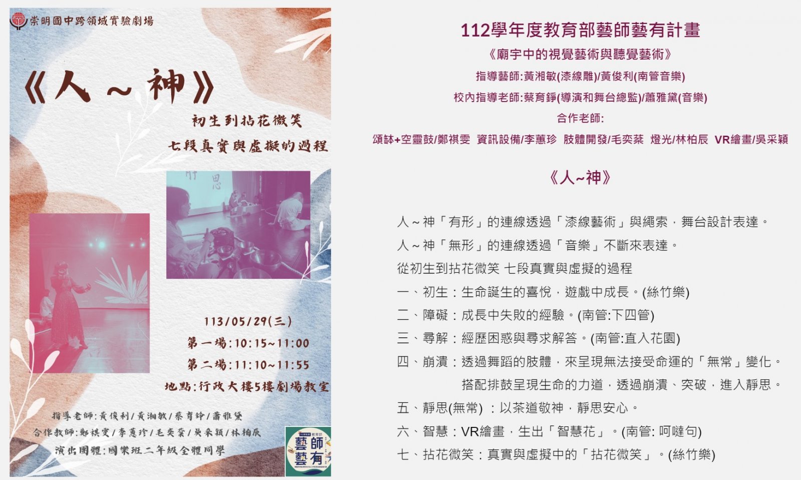 七、歡迎各校有興趣教師踴躍報名參加,共同欣賞結合國樂、南管音樂、頌缽及空靈鼓、及科技 VR 領域,由學生擔綱詮釋人面對生命困頓時,由「惑」至「不惑」的頓悟歷程。