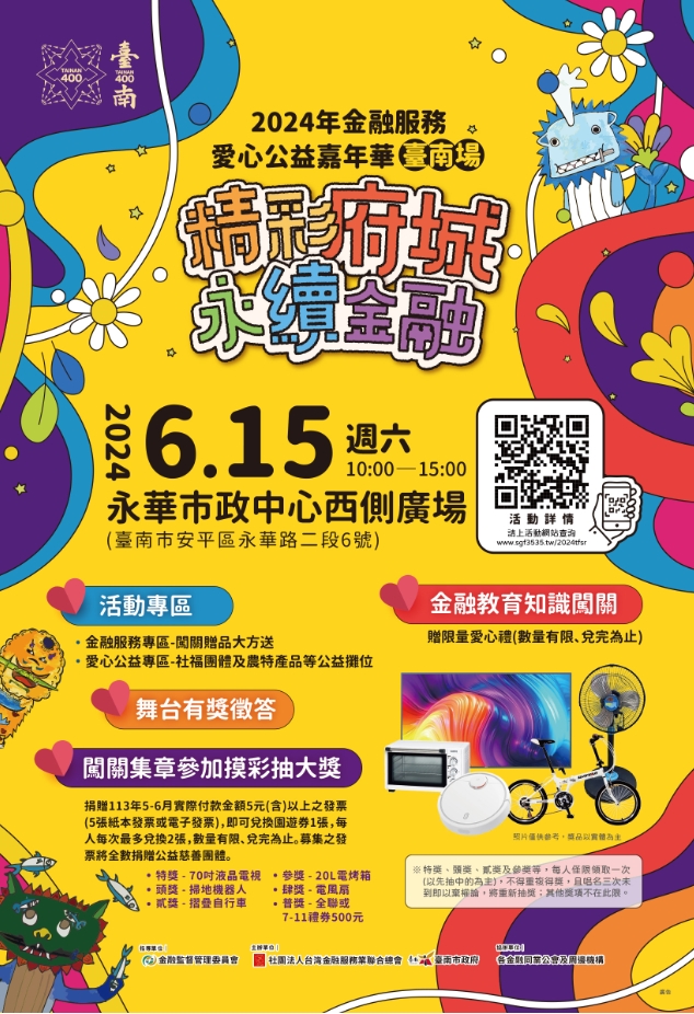 三、參加摸彩方式:捐贈 113 年 5-6 月實際付款金額 5 元以上之發票 5 張,即可兌換無面額園遊券 1 張。活動當天至金融教育攤位闖關集滿 3 個戳章,即可參加摸彩及兌換紀念品,摸彩品有 70 吋液晶電視等豐富大獎。