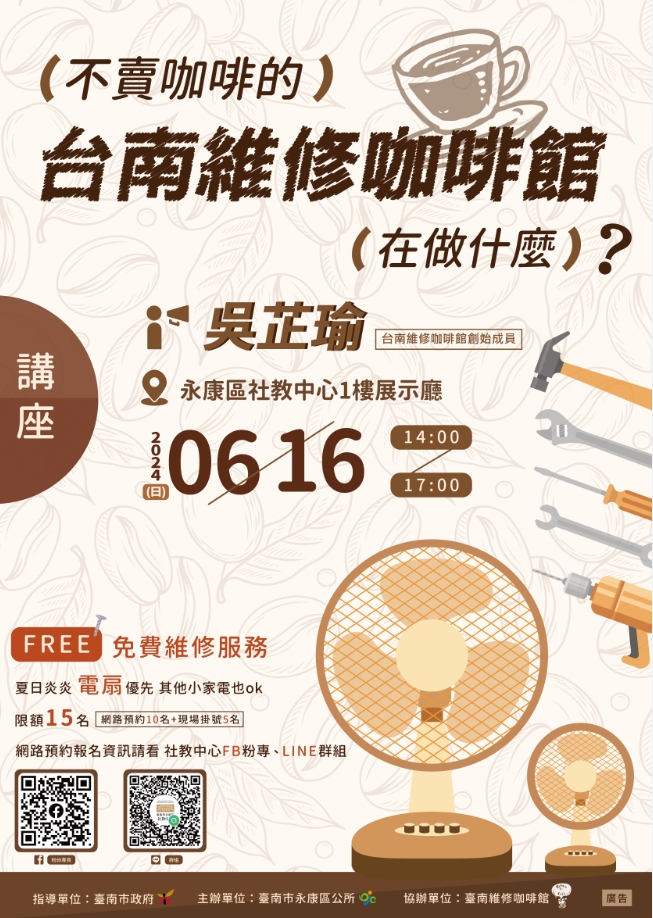 (三)本講座免報名自由入座,惟現場小家電免費維修服務須報名參加,限額 15 名(網路預約 10 名及現場掛號 5 名),報名方式即日起公告在社教中心 FB 粉絲專頁: https://www.facebook.com/YongkangSocialEducationCenter