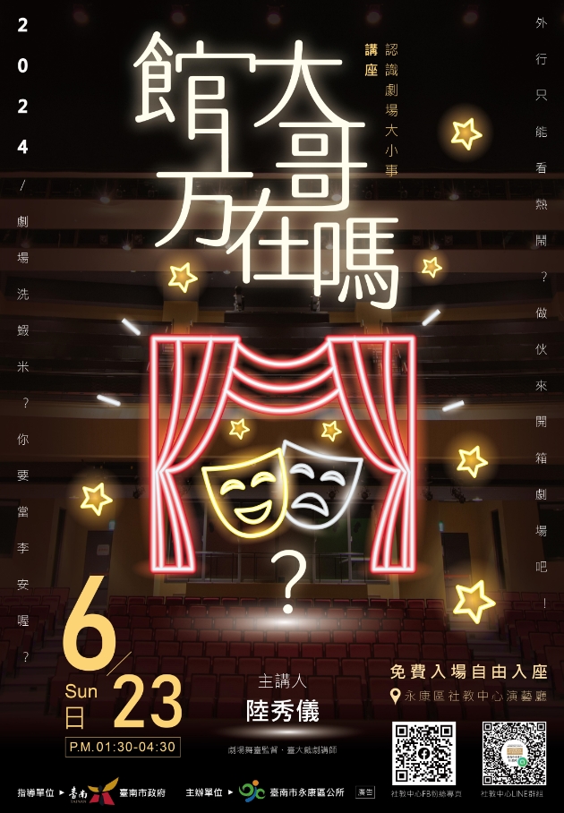 一、永康區社教中心演藝廳歷經整建,引進劇場級燈光音響設備,打造專業舞台及候場空間,為使市民朋友能夠認識此煥然一新的演藝廳,同時認識劇場工作台前幕後大小事,爰辦理旨揭講座,敬邀貴校師生及家長踴躍參加。