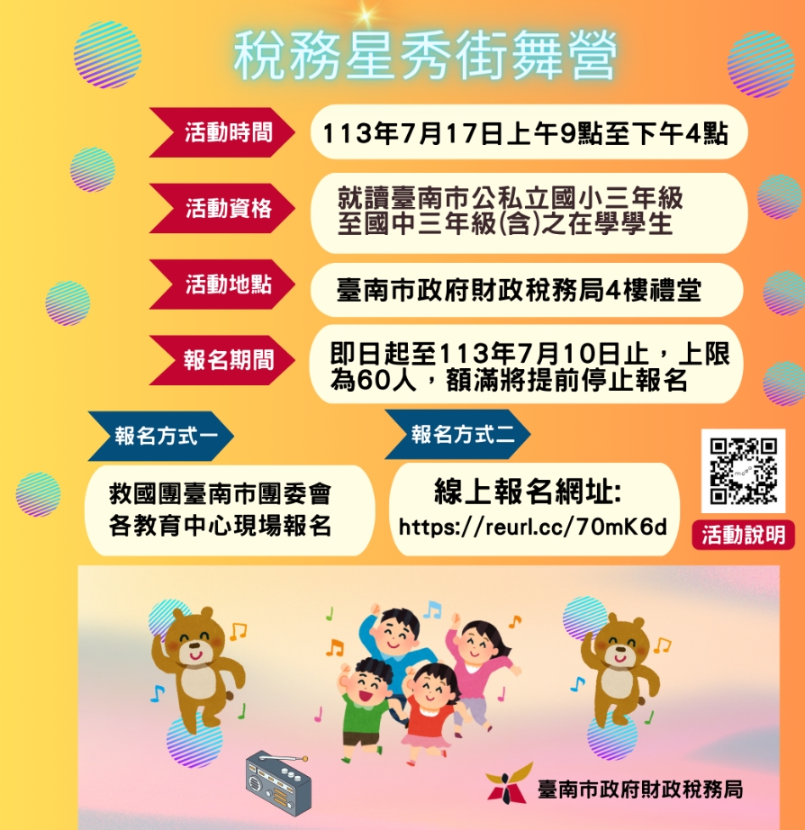 一、旨揭活動報名期間自即日起至 113 年 7 月 10 日止,學員上限為 60 人(額滿則提前截止),凡就讀本市公私立國小三年級至國中三年級(含)之在學學生均可報名參加,請利用線上報名(網址: https://reurl.cc/70mK6d)或至救國團臺南市團委會教育中心現場報名。