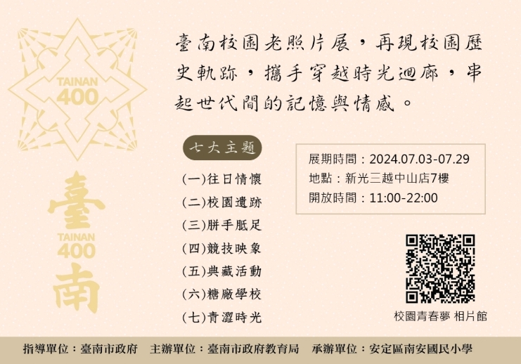 一、旨揭展覽匯集與精選出具代表性的老照片,串起教育現場演變的歷史軸線,用照片說故事,呈現出臺南 400 校園發展的軌跡及時代意義,連結世代間的記憶與情感,透過照片訴說當年青春故事。
