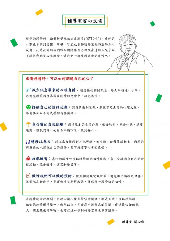 若你依舊感到恐慌不安達數天,或是身心及生活狀況受到嚴重的影響,可以與輔導室聯絡喔!