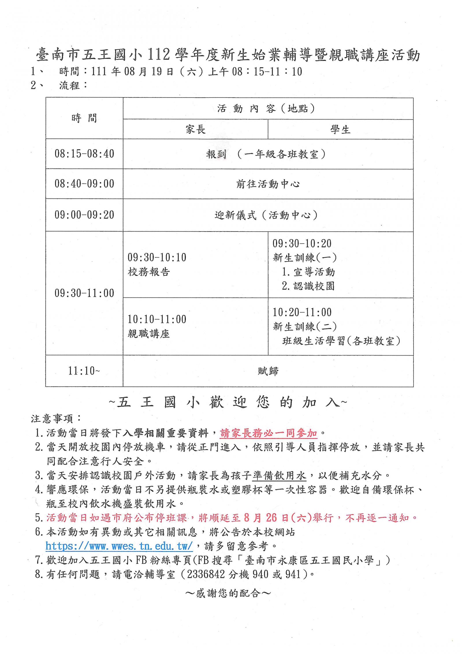 | 2025-06-17 重要 臺南市五王國小114學年小一迎新暨家長座談會活動將於114年8月30日辦理 |