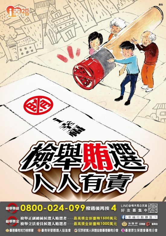 14.國家民主人民做主,臺南i幸福,選舉不買票不賣票,發現賄選可透過臺南 地檢署 LINE 官方帳號@973dairl 或撥檢舉專線 0800-024099 轉 4 檢舉,最高 檢舉獎金 1500 萬元。