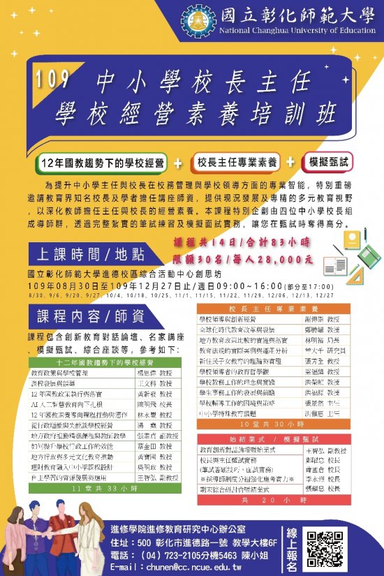 一、為提升中小學主任與校長在校務管理與學校領導方面的專業智能,特別重磅邀請教育界知名學者及校長擔任講座師資,提供現況發展及專精的多元教育視野,以深化其擔任主任與校長的經營素養;本課程以「十二年國教趨勢下的學校經營」、「校長主任專業素養」、「模擬甄試」三大主軸進行規劃;並於始結業式辦理「創新教育對話論壇」及「期末綜合座談」,以多面向學習範疇強化應考實力。