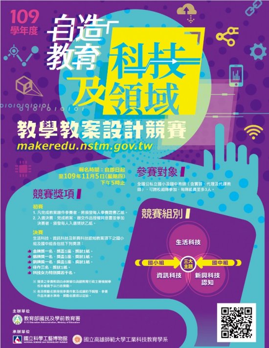 旨揭競賽係由教育部國民及學前教育署主辦,該館與國立高雄師範大學共同承辦,邀請全國中及國小教師(含實習、代理及代課老師),以「生活科技」、「資訊科技」及「新興科技認知」作為主題,並結合自造教育實作精神,經由教師們實際參與教學實務設計,表達教學創意概念,期望能創造出新穎且具創意性,並能有效達成教學目標之學習活動,將相關成果落實於教學之中。