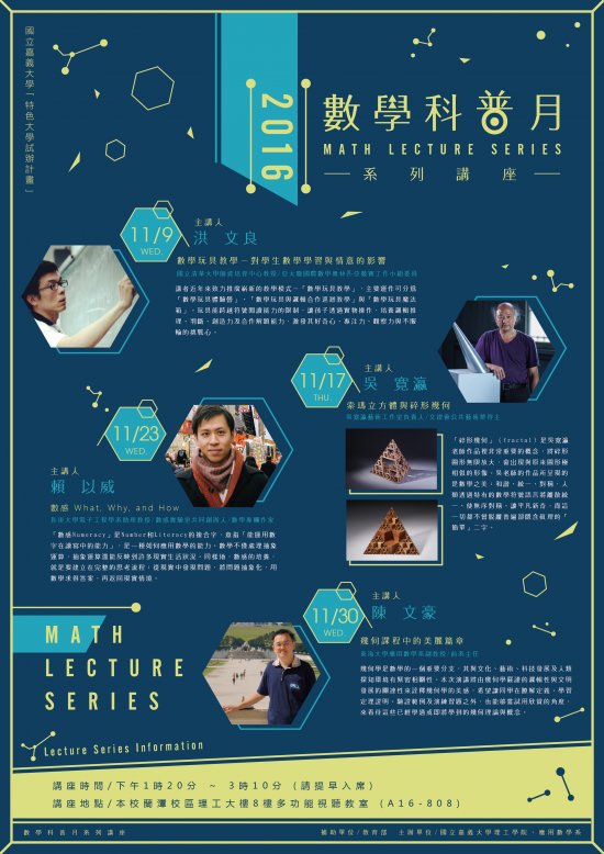 1、講座時間: 105 年 11 月 17 日(星期四),下午 1 時 20 分至 3 時 10 分。