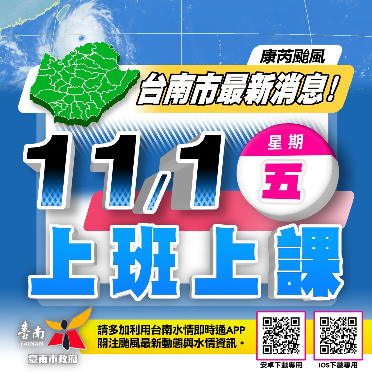 (!!!)根據中央氣象署資訊,明(11/1)日(週五)台南市風力及雨量預測,未達停班停課標準,臺南市政府 10/31 日晚上 8 點宣布,明(11/1)日照常上班、照常上課。