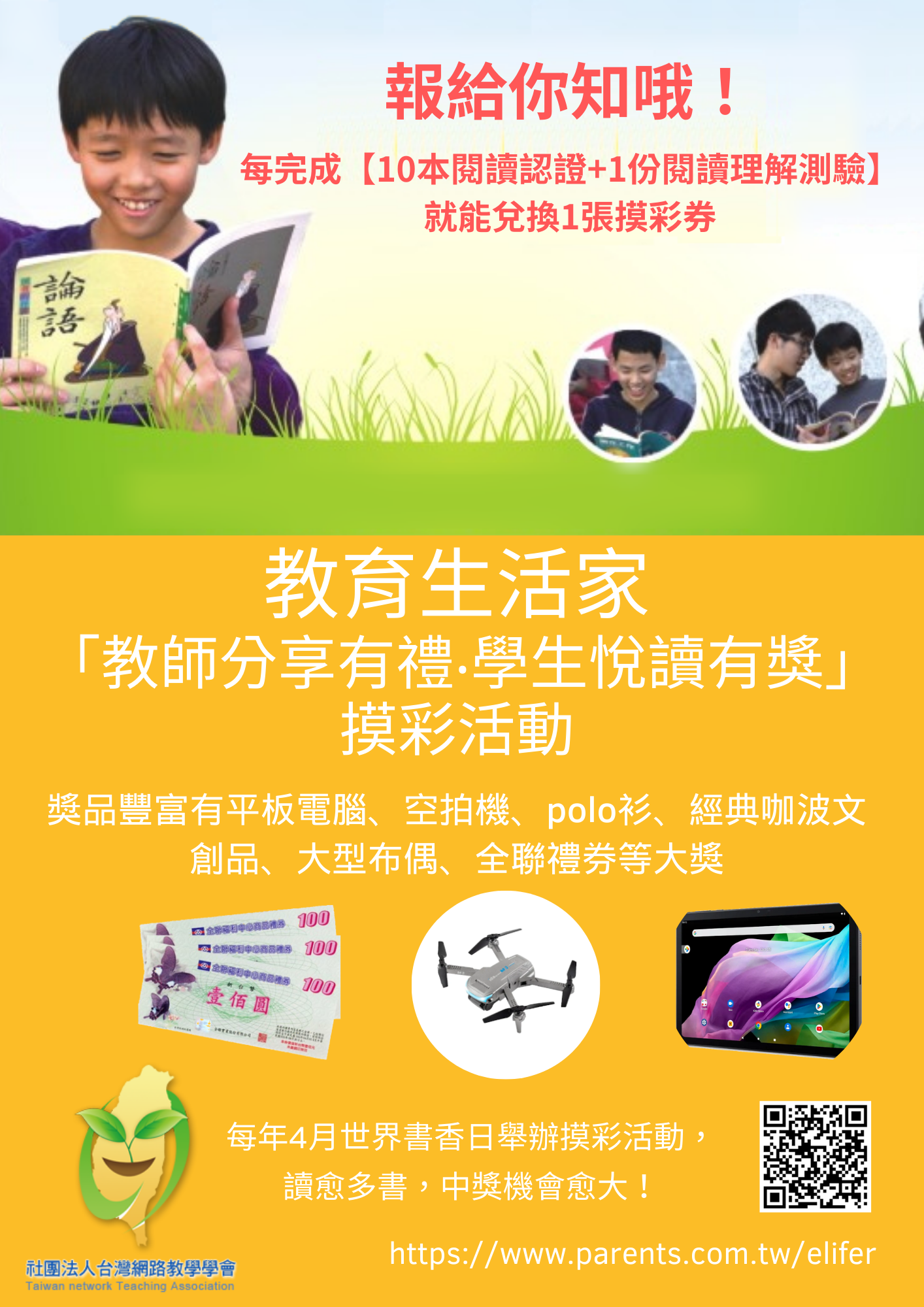摸彩獎品有空拍機、平板電腦、經典咖波文創品、大型布偶、 polo 衫、全聯禮券等等大獎,獎品豐富,學生只要每完成【閱讀認證 10 本+閱讀理解測驗 1 份】就能兌換 1 張摸彩券,讀愈多書,中獎機會愈大,請貴校給孩子機會,也給孩子信心,內容詳見 https://www.parents.com.tw/elifer/lottery 。