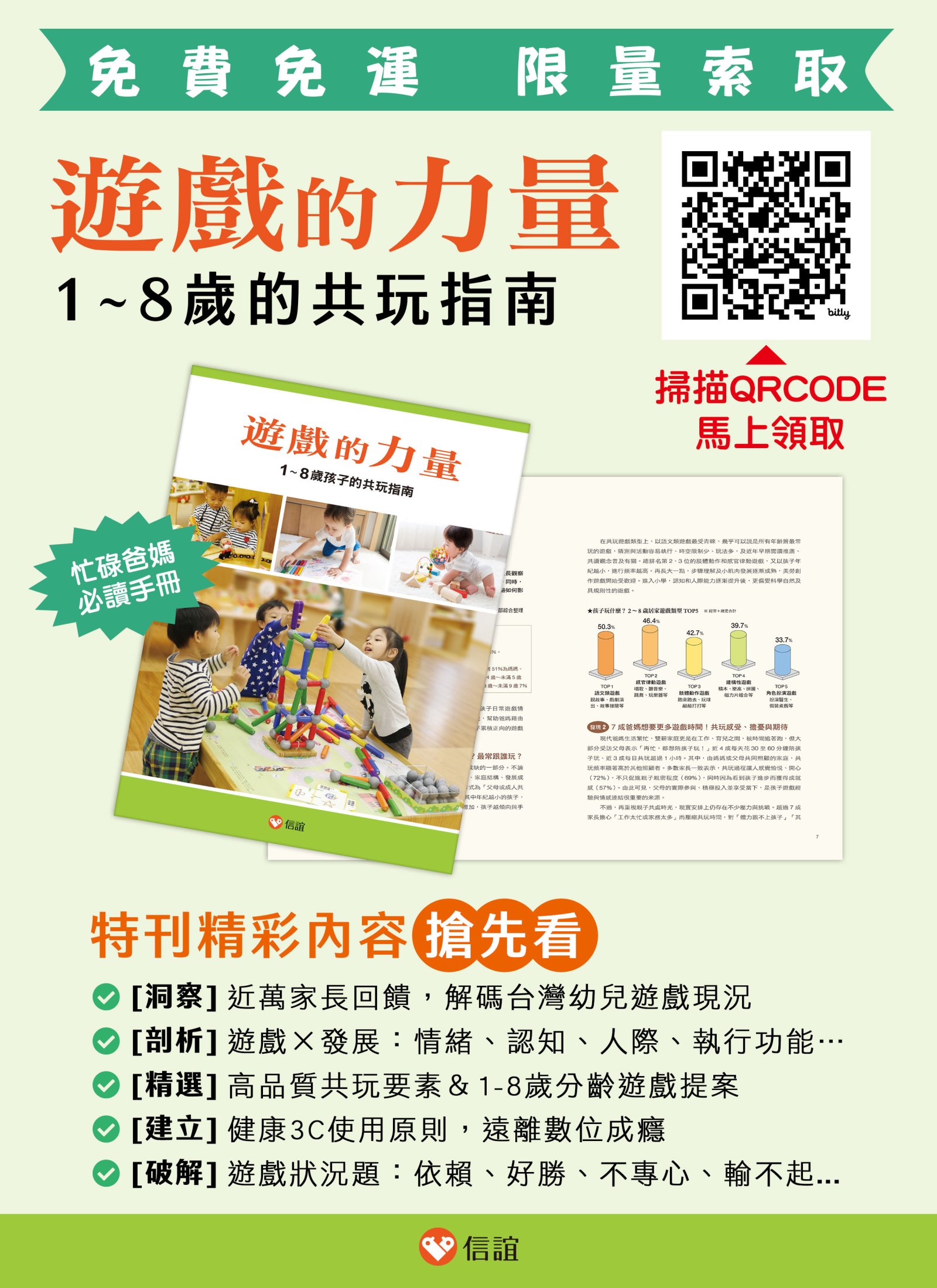 二、《遊戲的力量: 1-8 歲孩子的共玩指南》特刊以協助家長和照顧者提升共玩與互動的品質,讓孩子玩出成長關鍵力為主要目標,是現代父母提高遊戲效能、增加共玩靈感的必讀實用手冊。即日起,開放【免費免運索取】敬請轉知 貴校家長 線上索閱: https://bit.ly/3HqXvp6