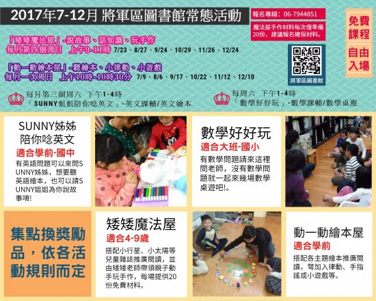 檢送本區圖書館辦理「106 年 7 月-12 月常態免費活動」文宣(電子檔),請貴單位協助於官網、臉書、 LINE 社群、跑馬燈及公布欄等公告宣傳。