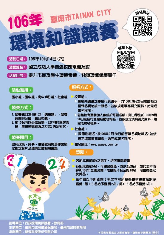 說明:相關海報或簡章資料可至本局環境教育資訊網(http://epb2.tainan.gov.tw/tnepb_edu/)知識競賽專區下載。