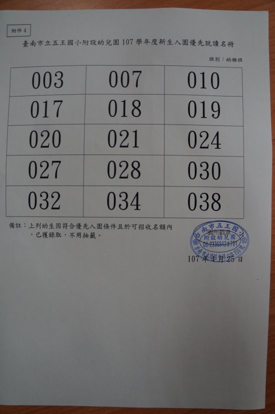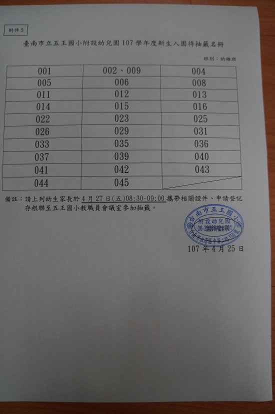 四、新生入園待抽籤名冊內幼兒,請於 4/27(五) 8:30 起至會議室報到,查驗「登記收執聯」