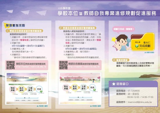 二、請在期限內(9月 30日前)上網至「教師自我專業進修研習規劃服務」網頁填寫105學年度之學習需求規劃。