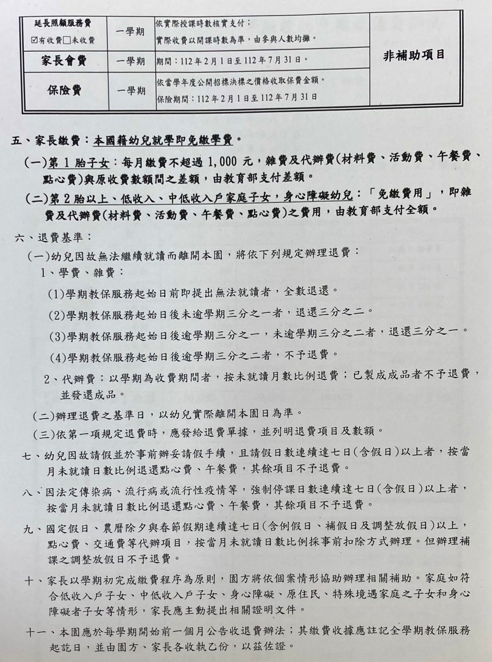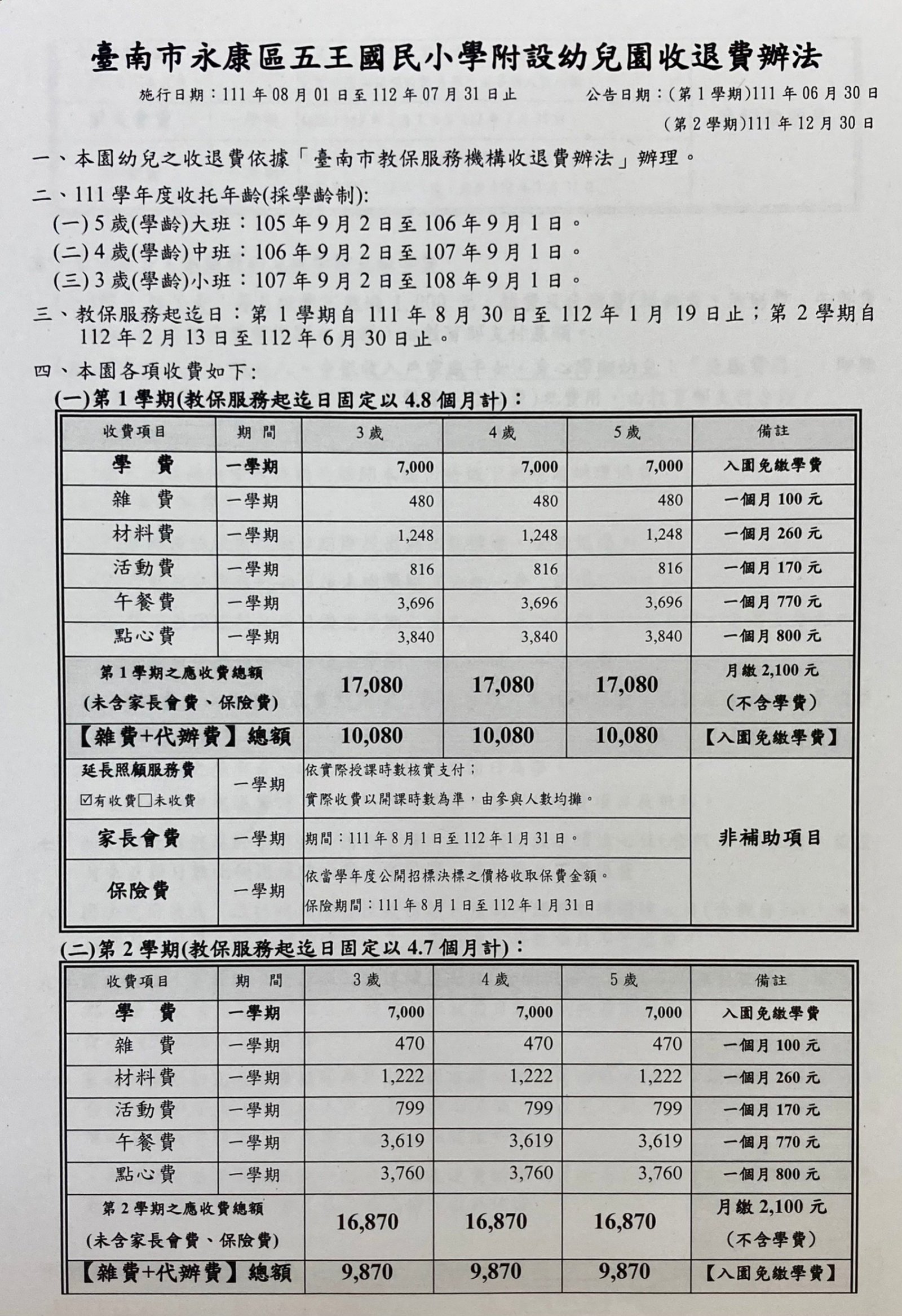 五王國小附幼 111 學年收費與收退費辦法如附件