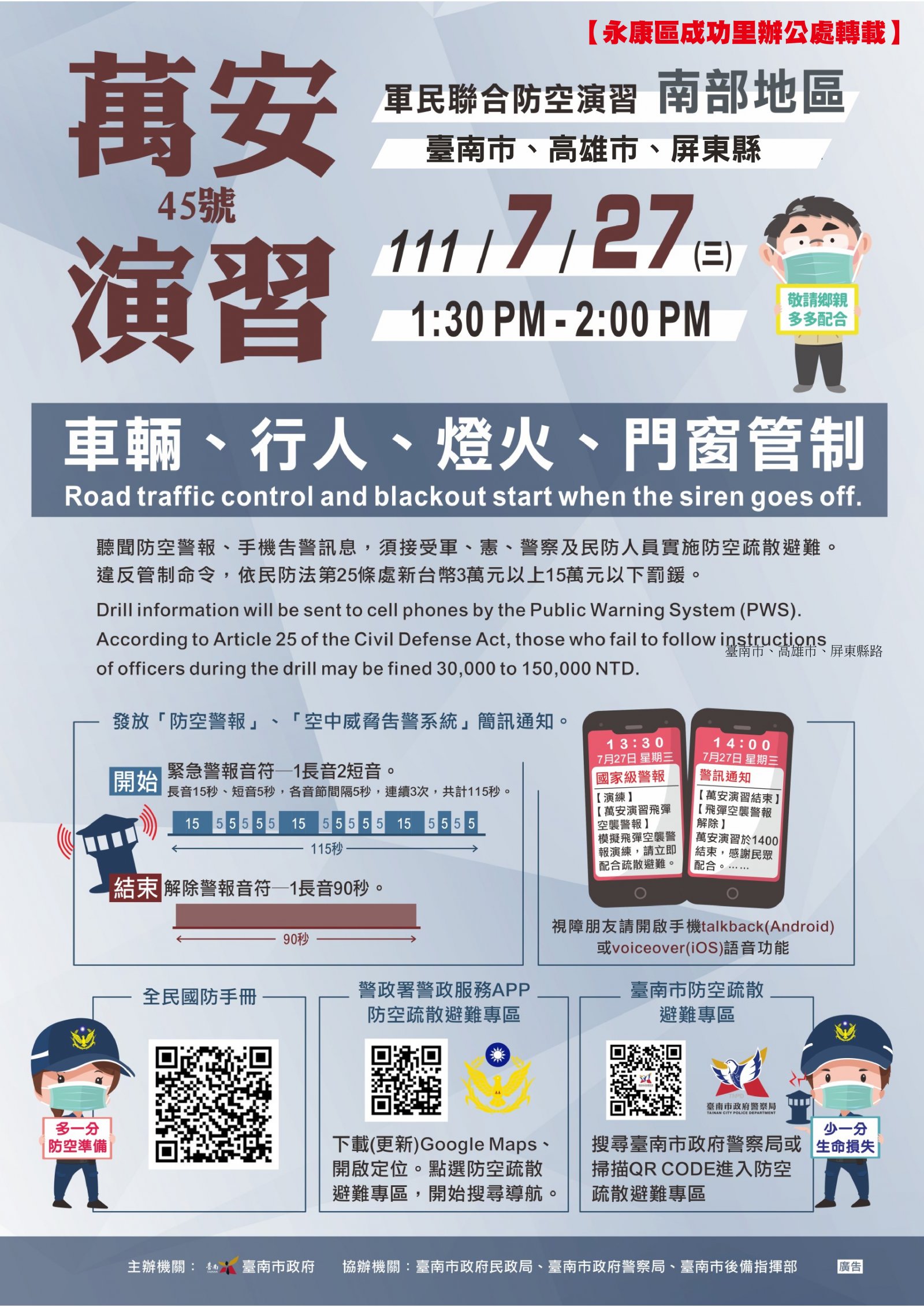 二、旨揭演習南部地區(臺南市、高雄市、屏東縣)同時利用「行動電話簡訊」系統通知防空警報,籲請民眾支持配合,演習期間應注意下列事項: