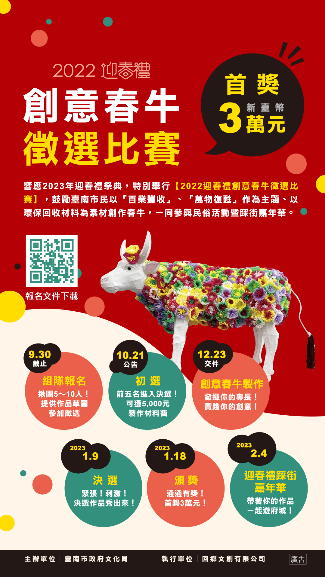 一、「2022 迎春禮創意春牛徵選比賽」報名資訊如下: