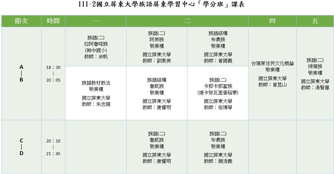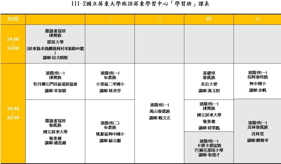 (二)上課地點:該校屏師校區敬業樓、高雄市桃源區興中國民小學、高雄市山林區巴楠花部落小學、高雄市那瑪夏區瑪雅里、高雄市那瑪夏區達卡努瓦里。