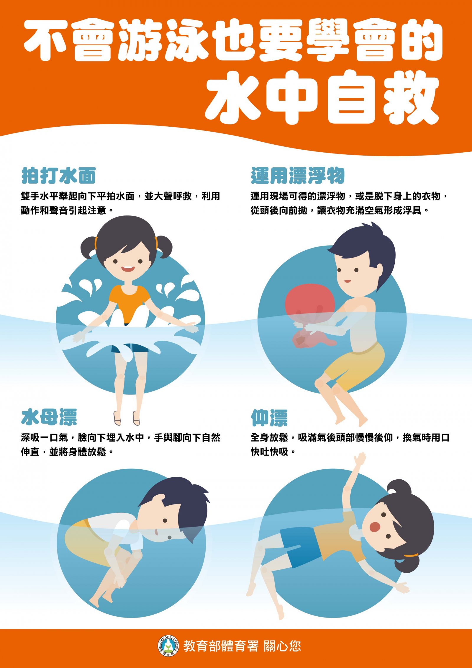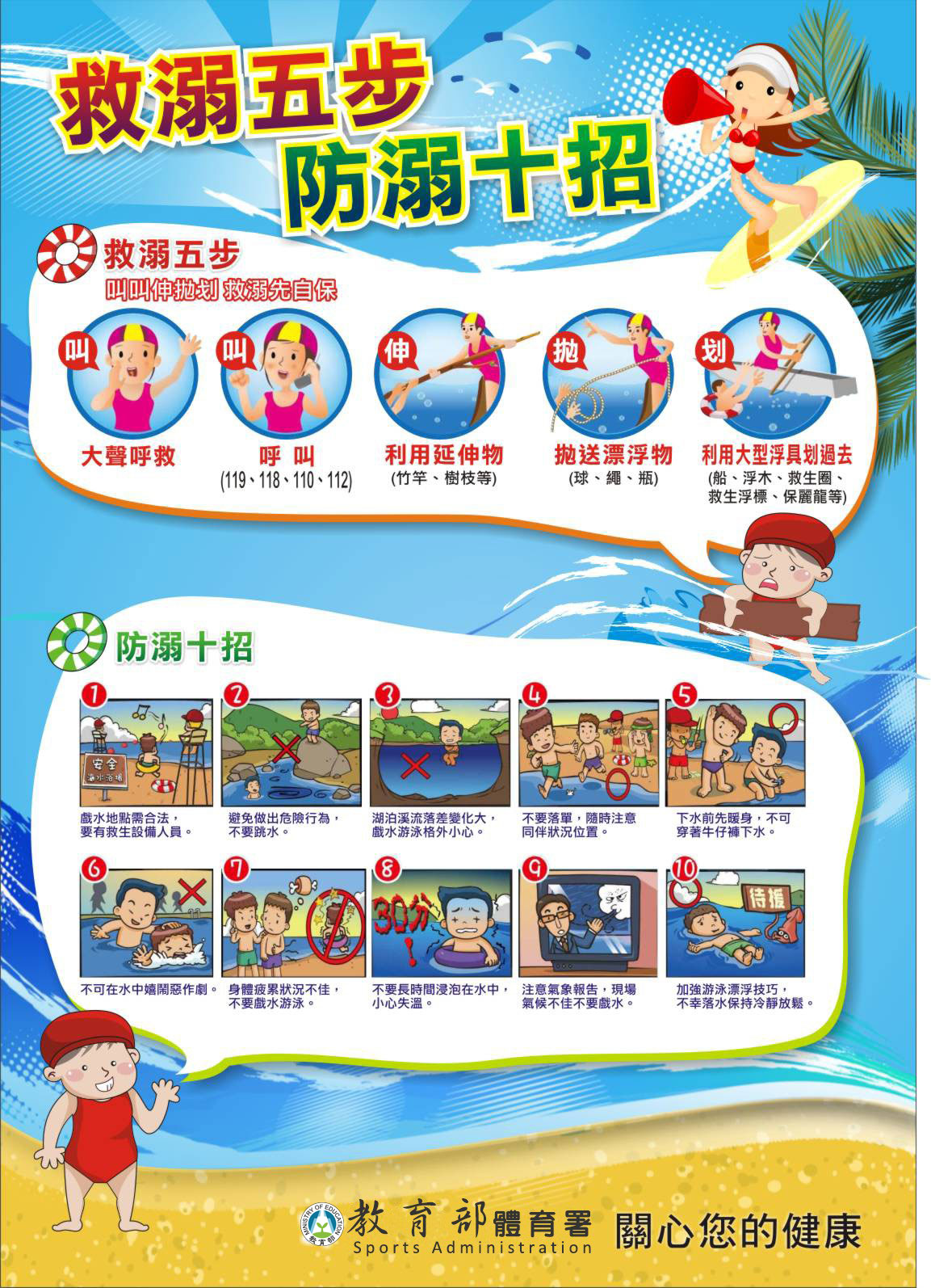 「生命無價」!再次呼籲並提醒家長,多一份關心,多一點叮嚀,參與水域活動謹記「救溺五步」及「防溺十招」(詳見附件資訊),切勿輕忽任何可能發生的危險,避免溺水事件悲劇再次發生,讓我們共同守護學生生命安全!