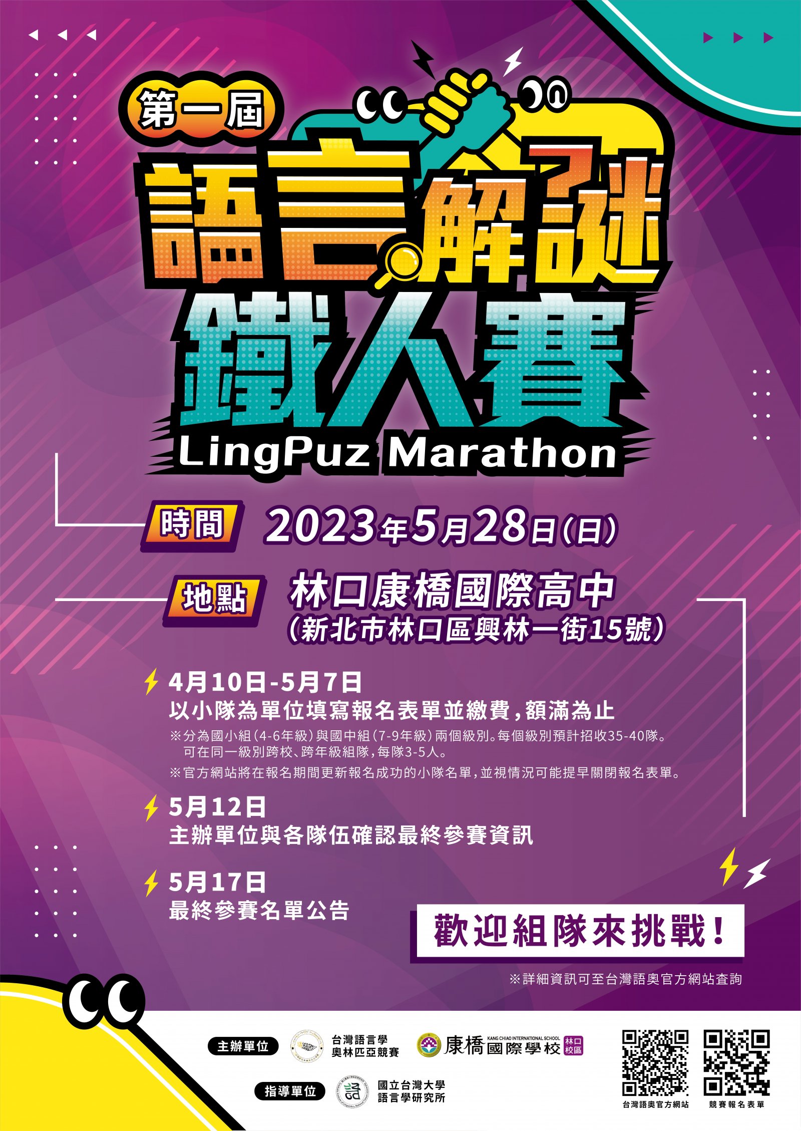 台灣大學語言學研究所將於 112 年 5 月 28 日舉行「2023 年第一屆語言解謎鐵人賽」,針對國中(一年級至三年級)、國小(四年級至六年級)學生推廣台灣語言學奧林匹亞競賽,並鼓勵對語言學有興趣的學生做更進一步的學習、探究,鼓勵學生踴躍參加。