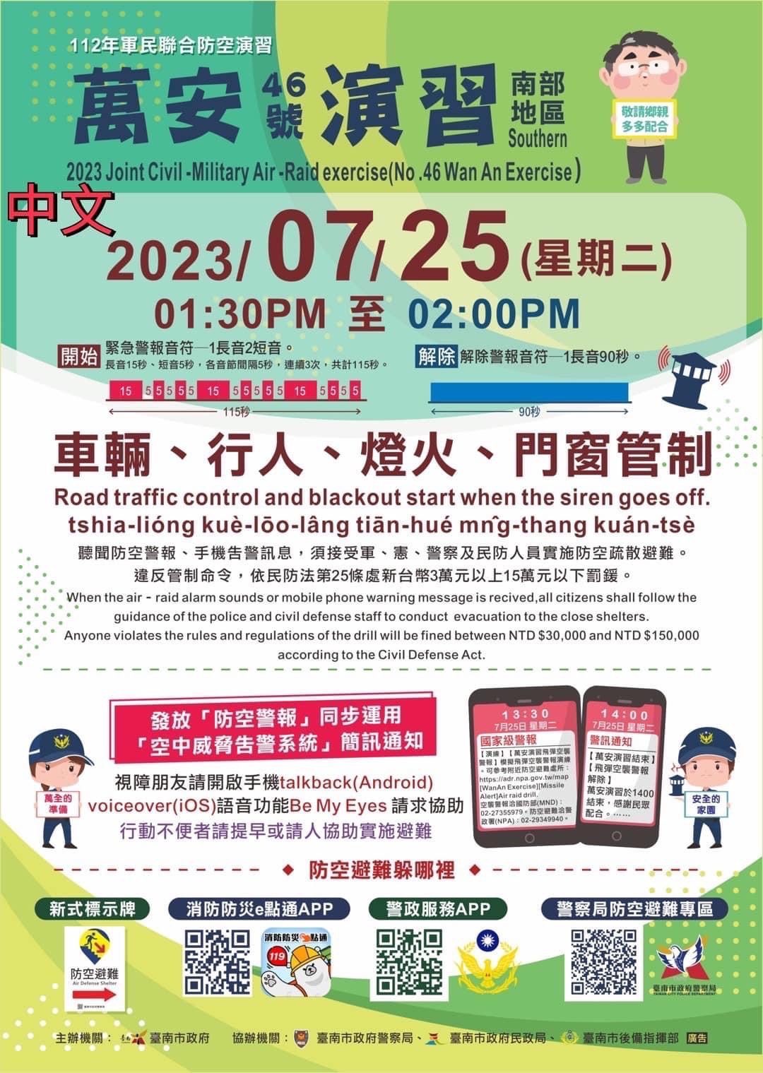 今年「萬安 46 號演習」訂於 7 月 25 日(星期二)下午 1 時 30 分至 2 時實施,屆時警報發放後,人、車請一律配合警察及民防人員引導,進行防空避難。趕緊拿起手機知曉最近防空避難疏散地點!