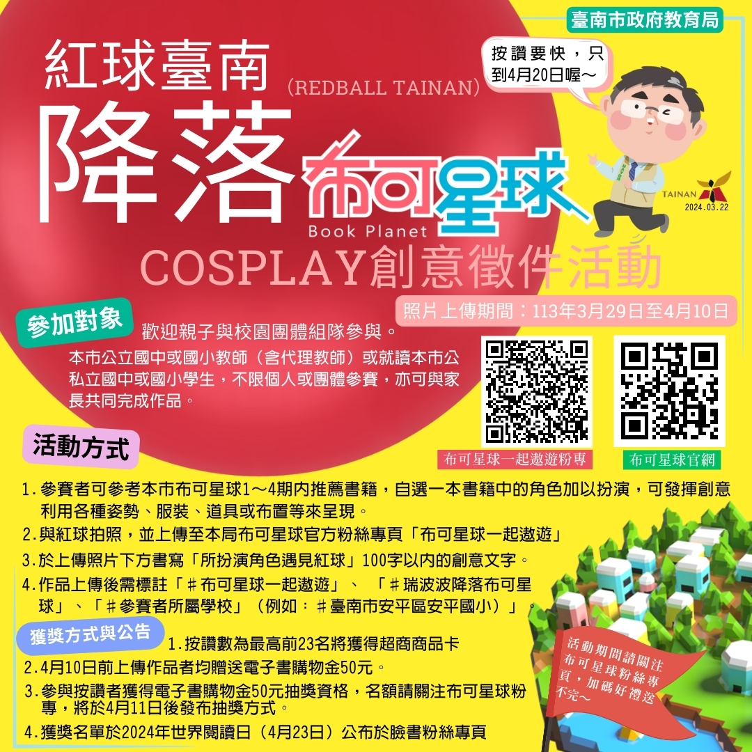 (二)至「紅球臺南 RedBall Tainan」的展覽地(請詳官網: https://www.facebook.com/redballtainan2024/),與紅球拍照,並上傳至本局布可星球官方粉絲專頁「布可星球一起遨遊」。